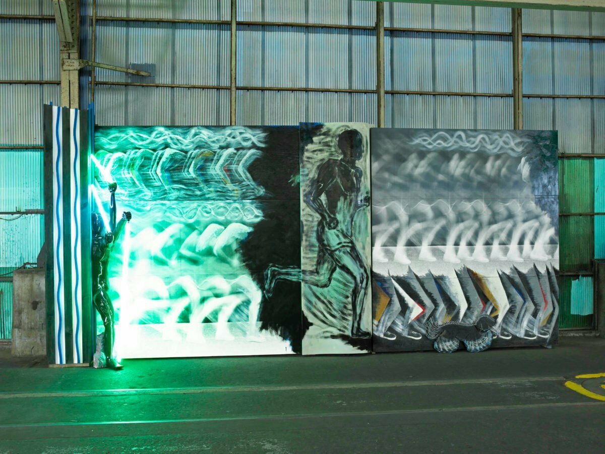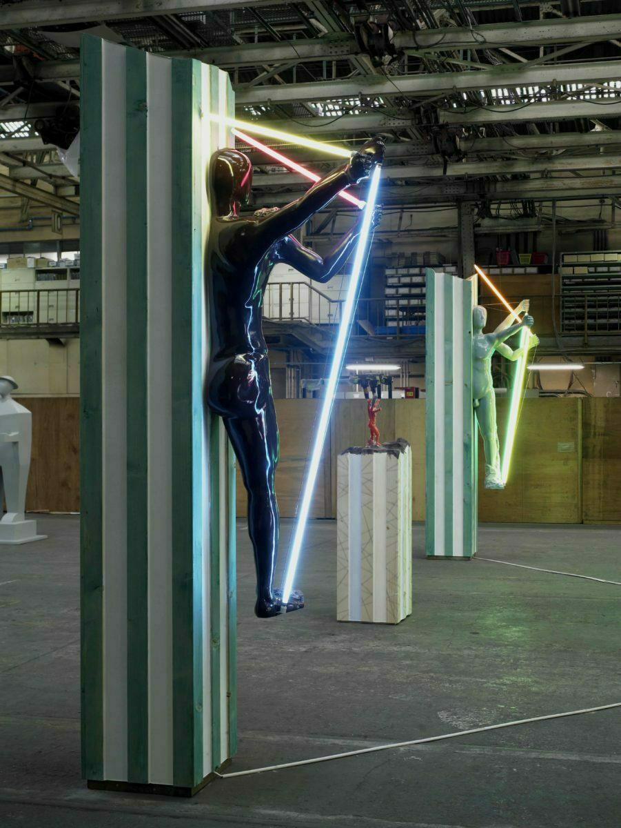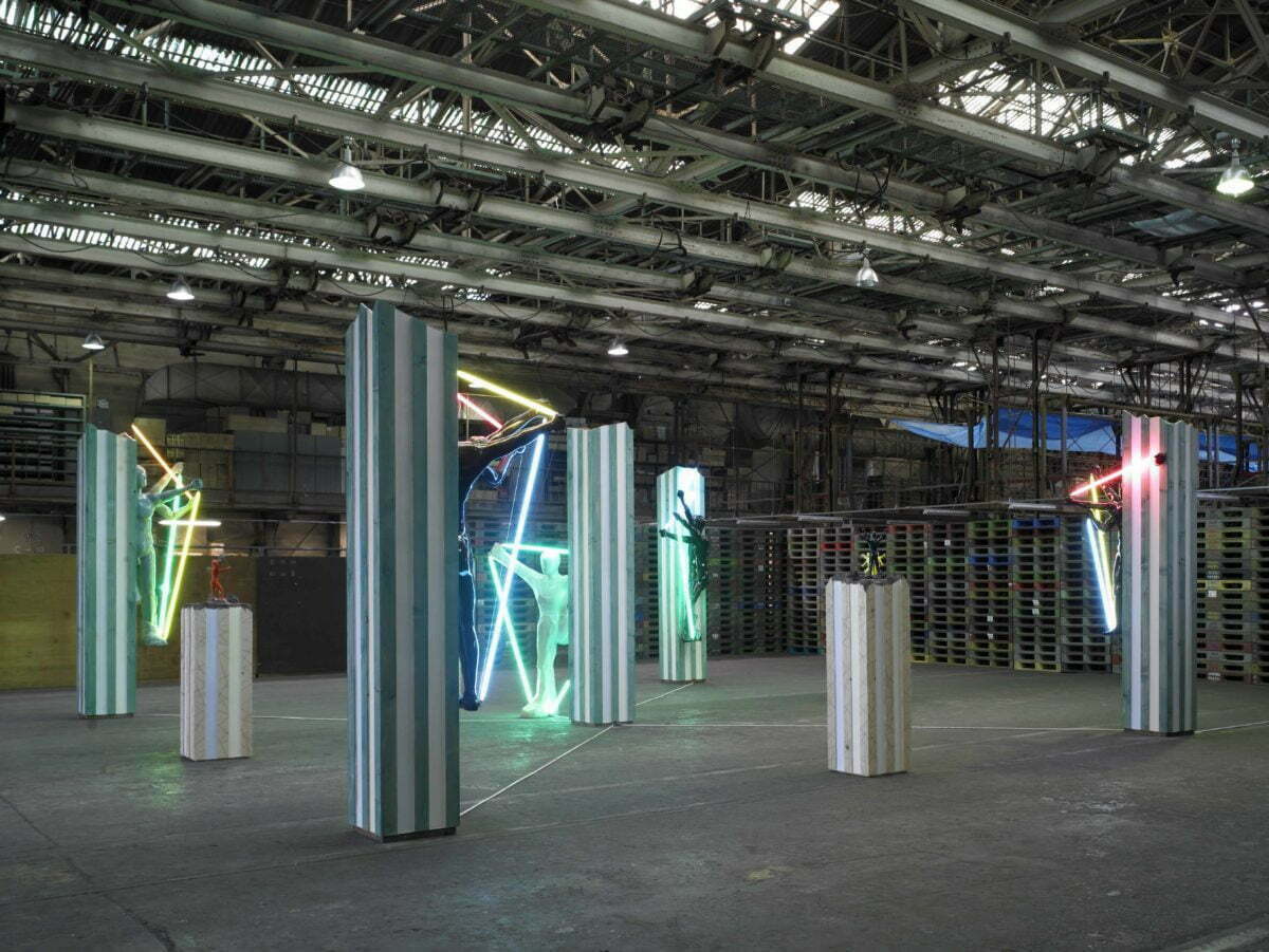 中央手前:ポリエステル樹脂・木・スリムライト・和紙(330×110×55cm)