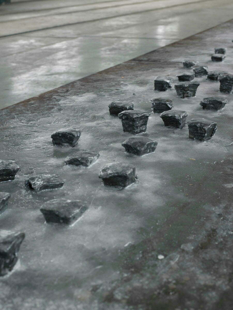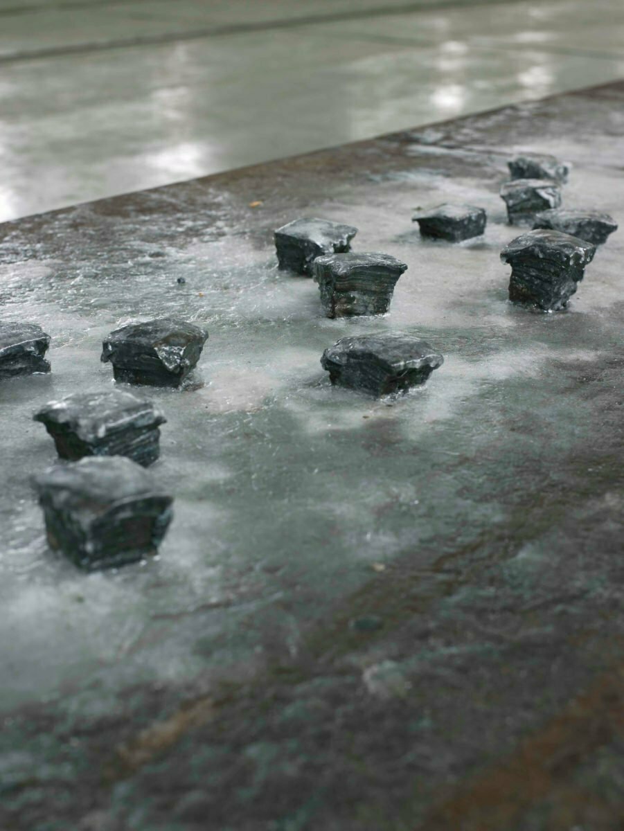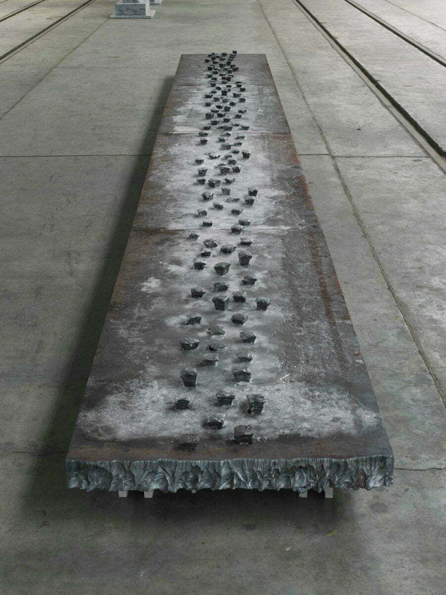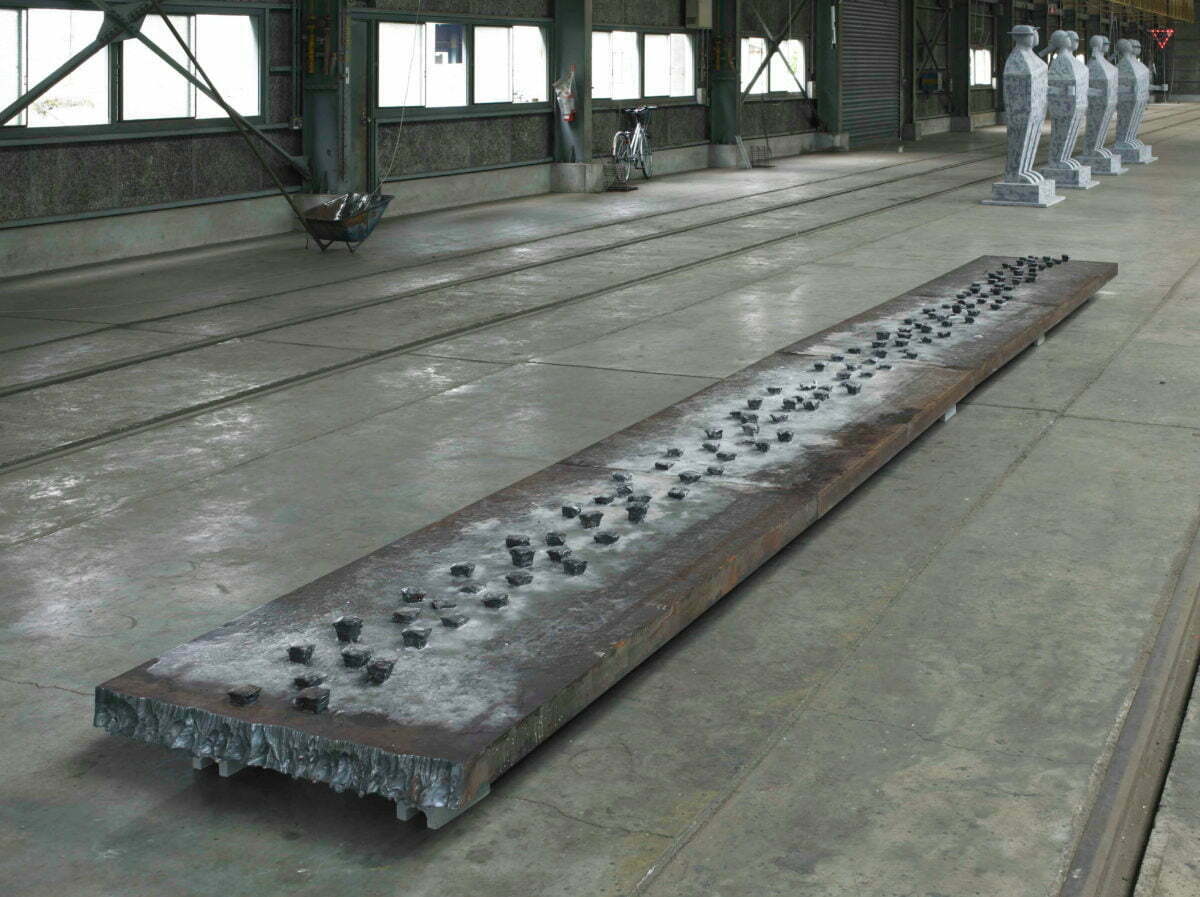 鉄、蝋、熱、ガラス、金槌、鉄板 856×90×15cm 展覧会:第一回 所沢ビエンナーレ美術展 引込線 撮影者:山本糾